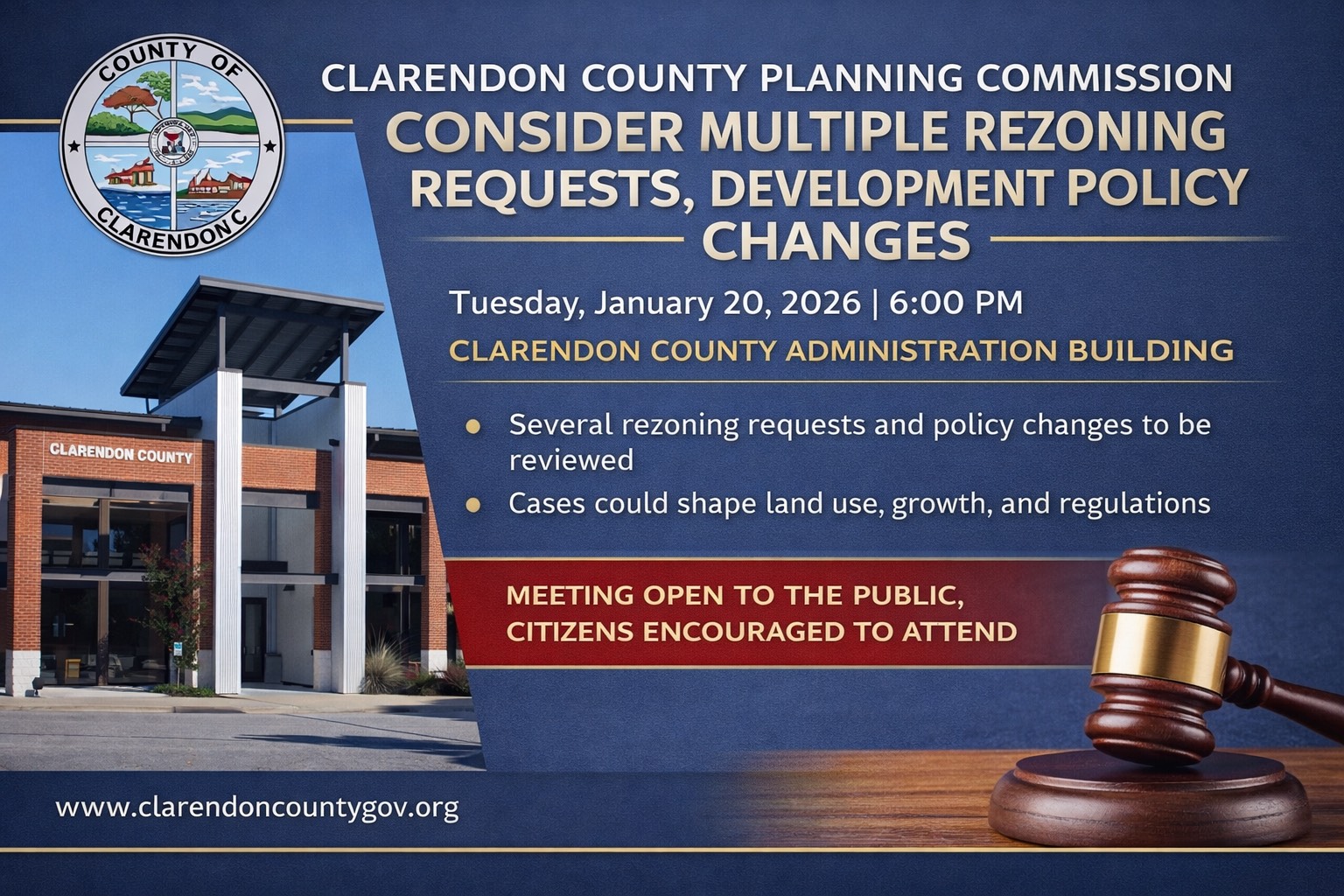 By PSA Newsroom Staff The Clarendon County Planning Commission will meet Tuesday, January 20, 2026,